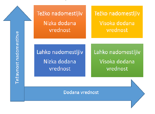 - Delovna mesta v spodnjem desnem kvadrantu (lahko nadomestljiv, visoka dodana vrednost) bi bilo potrebno preoblikovati, da bi bila bolj edinstvena in različna od konkurence (tako bi postala težje nadomestljiva).