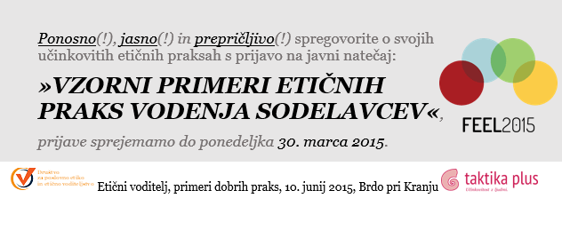 Javi natečaj se bo končal na konferenci Feel 2015. Konferenco o poslovni etiki letos pripravljamo na temo Etični voditelj. Z aktivnim sodelovanjem boste opozorili na svoje etične prakse in omogočili razvoj družbe kritične do etičnega poslovanja, ki krepi in podpira učinkovita vedenja in transparentne odločitve.