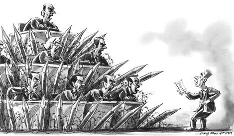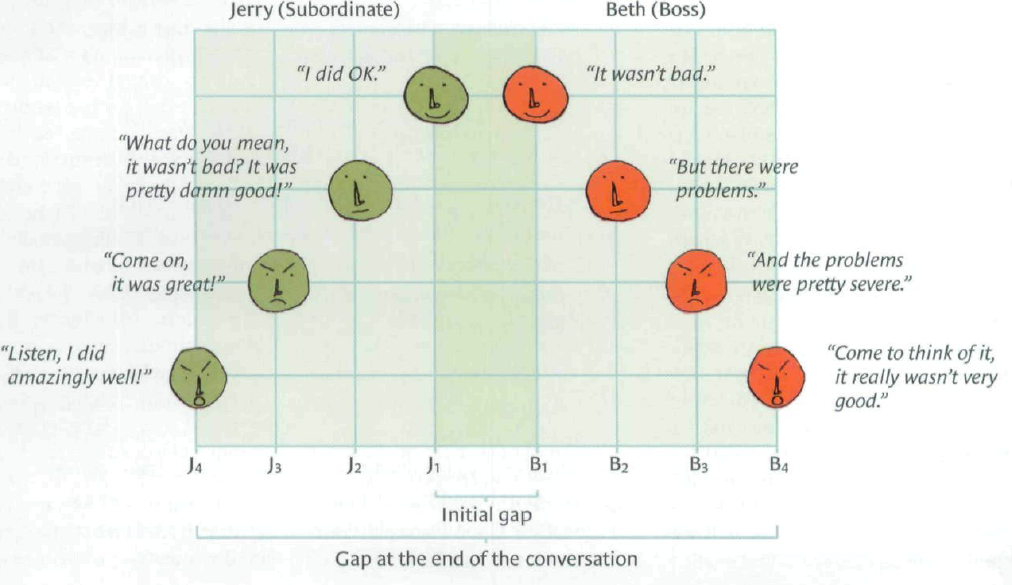 Na sliki je jasno prikazano stopnjevanje agresivnosti pogovora ter vsiljevanje svojega mnenja drugemu udeležencu. Na tak način se širi razkorak mnenj v pogovoru. Pogosto pridemo do točke, ko eden izmed sogovornikov nenamerno izreče nekaj pretirano kritičnega. Rezultat takšnega pogovora je, da podrejeni ne sprejme novice, ki jo želi nadrejeni sporočiti. Nadrejeni to pogosto pripišejo ponosu ali obrambi zaposlenih. Vendar pa je potrebno razumeti, da ima nadrejeni pomembno vlogo pri tem, kako podrejeni sprejme novico.