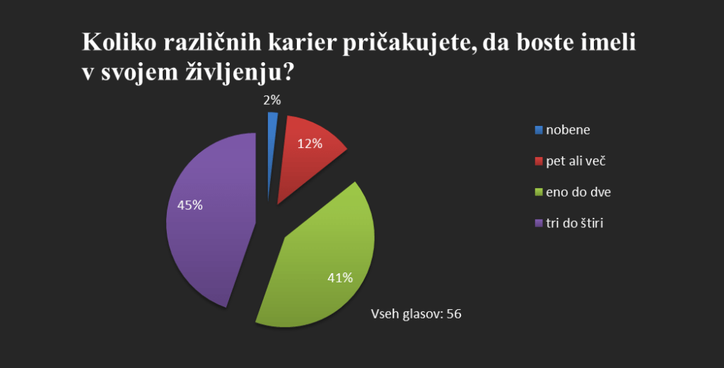 Tokrat ste v naši spletni anketi odgovarjali na vprašanje o številu pričakovanih karier. Kaj sploh pomeni delovna kariera? V osnovi gre za vzorec delovnih izkušenj, ki usmerjajo posameznikovo življenje (Greenhaus idr., 2000). Vendar pa se je dojemanje pojma kariere skozi 20. stoletje spreminjali, predvsem zaradi razvoja tehnologije in spreminjanja trga dela. Mladi iz t.i. generacije Y tekom svojega dela vedno pogledujejo za novimi delovnimi mesti. Zaradi visoke stopnje brezposelnosti in zmanjševanja števila pogodb za nedoločen čas, je vedno več samozaposlenih posameznikov, projektnega dela in spreminjanja kariernih usmeritev. Zato se spreminja tudi pojmovanje kariere. Medtem ko so včasih zaposleni napredovali znotraj istega podjetja, sta danes bolj značilni proteanska kariera in kariera brez mej. Proteanska kariera predstavlja kariero, ki jo posamezniki oblikujejo v skladu z lastnimi vrednotami, kriteriji uspeha pa so subjektivni. Kariera brez mej je neodvisna od organizacijskih smernic za oblikovanje kariere in vsebuje priložnosti, ki vključujejo več kot enega delodajalca. Tudi delodajalci cenijo fleksibilnost, po drugi strani pa se posamezniki ne želijo omejevati samo na eno delovno mesto. Odgovori v anketi z naše spletne strani kažejo na to, da skoraj polovica (45%) posameznikov pričakuje, da bo imela tri ali štiri kariere, kar pomeni, da se ne želijo omejiti le na eno delovno mesto. Malo manj (41%) jih pričakuje eno ali dve karieri, iz česar lahko sklepamo, da je zaposlenim še vedno pomembna varnost delovnega mesta. Približno desetina (12%) je odgovorila, da pričakujejo celo pet karier ali več. Pojmovanje kariere se razlikuje med različno starimi posamezniki, ki pripadajo različnim generacijam, zato bi bilo zanimivo raziskati, kakšne so razlike v številu pričakovanih karier med različnimi generacijami. Zagotovo pa obstajajo razlike med posamezniki, saj se v zahodni kulturi poudarja individualnost, pomembnejši kot objektivna uspešnost v karieri pa je posameznikov lastni pogled na uspešno kariero. Marci Alboher je leta 2007 napisala knjigo z naslovom One Person/Multiple Careers: A New Model for Work/Life Succes. V njej opisuje t.i. slash kariere, kar pomeni, da se posameznik lahko identificira z več delovnimi pozicijami ali nazivi. Pravi, da je doživljenjska služba izgubila mesto simbola ekonomske varnosti, saj se zaposleni zavedajo, da je od njih odvisen tako njihov dohodek kot izkoriščen potencial in občutek zadovoljstva. Več o sodobni karieri si lahko preberete na: https://psihologijadela.com/2014/03/20/sodobna-kariera-in-pripadnost-poklicu/ https://sl.wikipedia.org/wiki/Kariera http://cognoscenti.wbur.org/2013/07/12/slash-careers-amy-gutman