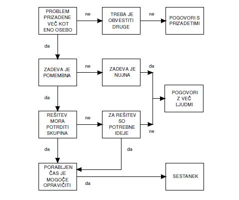 - NAMEN? Nameni sestanka so lahko različni. Eden izmed osrednjih je zagotovo izmenjava informacij povezanih s procesom dela. Če je za učinkovito delo potrebna interakcija le med dvema ali tremi člani tima, potem je organiziranje sestanka s celotnim timom lahko brez smiselno. Vseeno pa imajo sestanki določene prednosti. V nasprotju z digitalno komunikacijo (npr. elektronska pošta; ki predstavlja alternativno, ampak hitro obliko širjenja informacij), kot so, da vsi udeleženci slišijo isto ob istem času ter možnost dodatnih vprašanj za razjasnitev in možnost takojšnjega odziva na povedano. Prav tako sestanki omogočajo socialno interakcijo in krepitev občutka pripadnosti. Zaposlenim omogočajo, da se lahko izrazijo, se povežejo s kolegi in okrepijo zavest o skupnih ciljih in medsebojnem sodelovanju za dosego le-teh. Pri odločanju o tem, ali je čas za sklic sestanka je potrebno imeti v mislih oba navedena aspekta, pomagamo pa si lahko tudi s spodnjo shemo (Tomič, 1990). (Ne pozabite še na prej naveden vidik RELEVANTNOSTI SESTANKA, ki je opisan zgoraj).