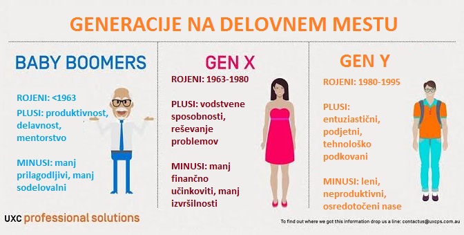 Danes samo nekaj uvodnih informacij o značilnosti pripadnikov znotraj različnih generacij na delovnem mestu preko infografike. Kmalu pa sledi tudi nekaj več informacij o učinkovitem vodenju v medgeneracijskem delovnem okolju.