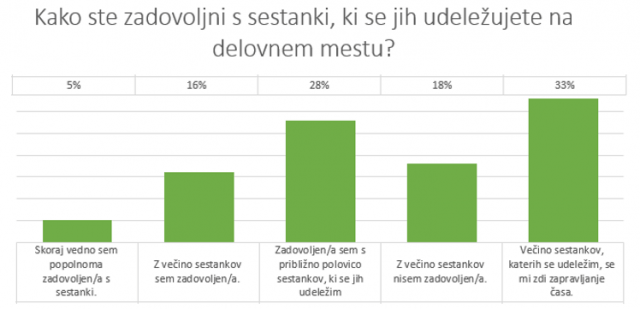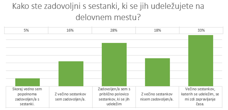 Z večino sestanki je zadovoljen razmeroma majhen delež zaposlenih, ki so odgovorili na naše vprašanje. Samo 5 % anketirancev pa je skoraj vedno popolnoma zadovoljnih.