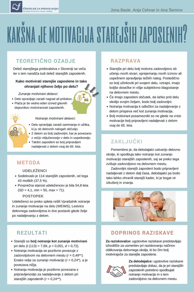 To je bilo eno od vprašanj, ki so si ga postavile študentke, ki so se v svoji raziskavi osredotočile na to, kako motivirati starejše zaposlene in tako ohranjati njihovo željo po delu. Ugotovile so, da se mlajši in starejši zaposleni v notranji in zunanji motivaciji za delo ne razlikujejo. Več o njihovih zaključkih si oglejte na spodnjem posterju ali pa si preberete njihov članek z naslovom Kako ohranjati željo po delu pri starejših zaposlenih: razlike v motivaciji med mlajšimi in starejšimi zaposlenimi.