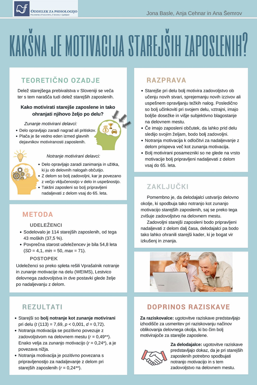 To je bilo eno od vprašanj, ki so si ga postavile študentke, ki so se v svoji raziskavi osredotočile na to, kako motivirati starejše zaposlene in tako ohranjati njihovo željo po delu. Ugotovile so, da se mlajši in starejši zaposleni v notranji in zunanji motivaciji za delo ne razlikujejo. Več o njihovih zaključkih si oglejte na spodnjem posterju ali pa si preberete njihov članek z naslovom Kako ohranjati željo po delu pri starejših zaposlenih: razlike v motivaciji med mlajšimi in starejšimi zaposlenimi.