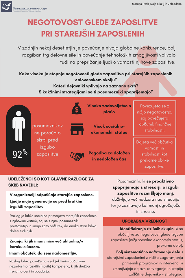 Študentke magistrskega študija psihologije so raziskovale, kakšna je stopnja negotovosti glede zaposlitve pri starejših zaposlenih v slovenskih organizacijah, kateri dejavniki vplivajo na zaznano skrb ter s kakšnimi strategijami se spoprijemajo. Sodelovalo je 197 zaposlenih, starejših od 50 let, rezultati pa so pokazali, da se negotovost glede zaposlitve pomembno povezuje s socialno-ekonomskim statusom, obliko zaposlitve in zadovoljstvom s plačo. Kot najpomembnejše razloge za skrb so navajali občutek hitre nadomestljivosti, občutek, da njihovo znanje ni v koraku s časom, da v okolici ljudje iste generacije izgubljajo zaposlitev ter odpuščanje zaposlenih znotraj organizacije. Več o njihovih rezultatih in zaključkih pa si lahko ogledate na spodnjem posterju ali pa si preberete celoten članek.