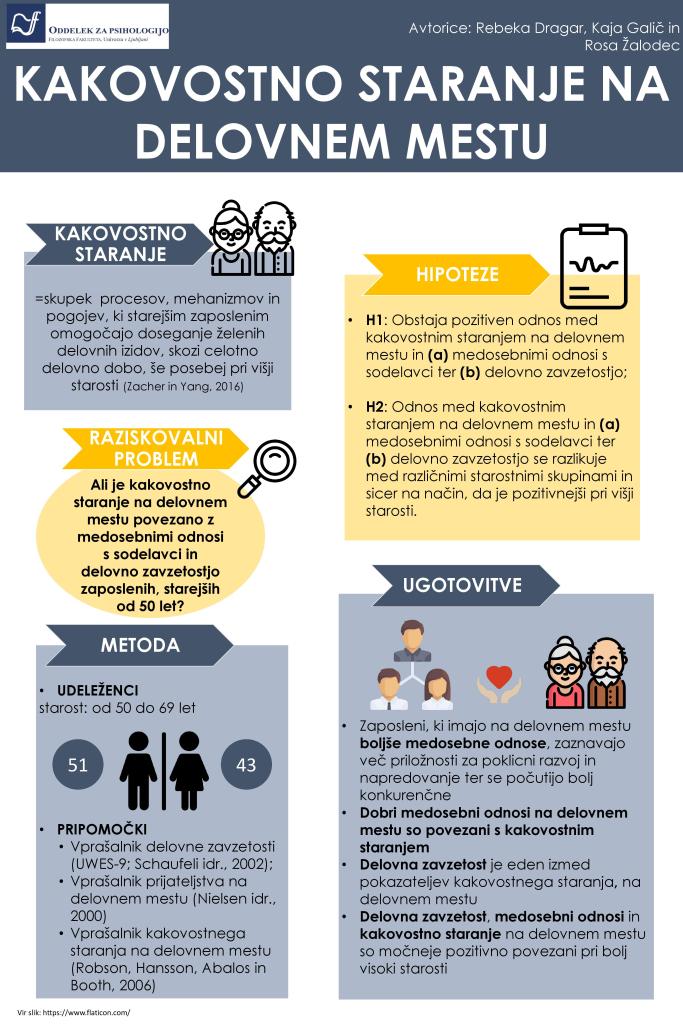 Kakovostno staranje na delovnem mestu je skupek značilnosti, ki starejšim zaposlenim omogočajo doseganje želenih delovnih izidov. Na to pa so se osredotočile tudi avtorice raziskave v Sloveniji, ki so želele ugotoviti, ali je kakovostno staranje na delovnem mestu povezano medosebnimi odnosi in delovno zavzetostjo zaposlenih, starejših od 50 let. Ugotovitve kažejo, da so vse tri spremenljivke med seboj pozitivno povezane. Doseganje želenih delovnih izidov pri starejših zaposlenih je torej povezano z dobrimi medosebnimi odnosi in njihovo delovno zavzetostjo. Podrobnosti raziskave pa si lahko preberete v članku.