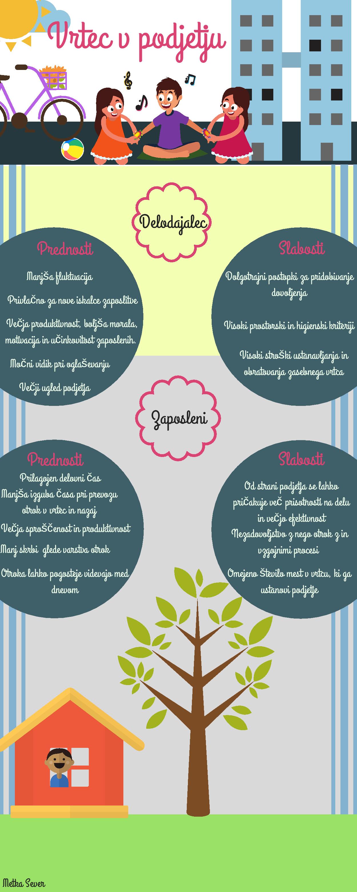 Tak način razmišljanja je po mojem mnenju nevaren. Če podjetje gleda na vrtec v podjetju le z vidika lastnih koristi, se lahko hitro zgodi, da zaradi te ugodnosti pričakuje daljšo prisotnost na delu in izboljšano efektivnost. To pa zaposlenemu ne bo olajšalo usklajevanja družinskega življenja z delovnimi obveznostmi, ampak bo lahko vodilo še v hujše nezadovoljstvo.