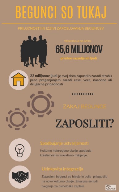 Migracije spremljajo človeštvo že od nekdaj. Danes, ko je mobilnost postala bolj dostopna in svojstvena potreba, so migracije še obsežnejši del vsakdana. Vsi migriramo; v službo, v šolo, na počitnice, v sosednjo državo, na daljno celino. Begunci migrirajo dolge kilometre, običajno v najbližjo varno državo, kjer upajo na to, da bo poleg osnovne varnosti za življenje prišla tudi socialna in ekonomska. Delo je zagotovo medij, preko katerega se vzpostavlja in ustvarja naš socialni in ekonomski sistem. Je bazična dejavnost človeka, preko katere posameznik izpolnjuje pomembne vloge in potrebe. Zaposlovanje beguncev je tako eden glavnih dejavnikov uspešne integracije in prilagoditve na novo kulturo. Vendar je vključevanje na trg dela dolgotrajen proces, ki prinaša nešteto izzivov in praktičnih ovir, za katere je potreben določen vložek in pripravljenost delodajalcev, da se jih skupaj odpravi.