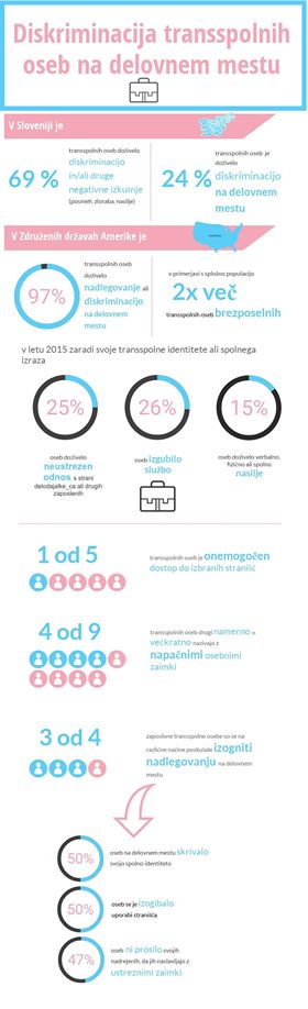 V prvi infografiki so najprej prikazani rezultati o diskriminaciji transspolnih oseb v Sloveniji, pridobljeni v okviru raziskave o potrebah transspolnih oseb v Sloveniji, v kateri je sodelovalo 65 transspolnih oseb, starih med 15 in 63 let. Infografika nadalje prikazuje tudi rezultate dveh velikih raziskav o izkušnjah transspolnih oseb v Združenih državah Amerike, ki podrobneje ilustrirajo, na kakšne načine se kažeta transfobija in diskriminacija transspolnih oseb na delovnem mestu.