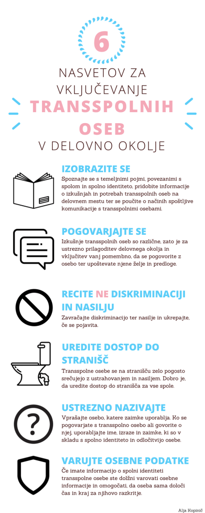 Pomembno je ustvarjati vključujoče delovno okolje za vse zaposlene, ne glede na njihove osebne okoliščine, kamor spada tudi spolna identiteta. Druga infografika prikazuje šest nasvetov za boljše vključevanje transspolnih oseb v delovno okolje.