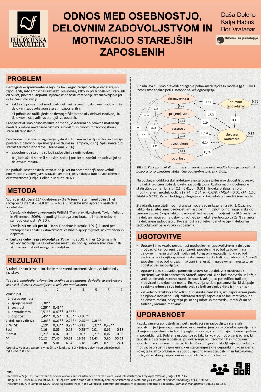 Raziskave kažejo, da na odločitev starejših zaposlenih o upokojitvi vplivata predvsem zdravje ter finančne spodbude, vendar pa je pri odločanju o tem, ali bodo ti zaposleni še ostali na delovnem mestu, pomembno tudi zaznavanje organizacije, motivacija ter zadovoljstvo zaposlenih na delovnem mestu. Študentje psihologije so zato v svoji raziskavi preučevali, kako so pri starejših zaposlenih povezani dejavniki njihove osebnosti, motivacije ter zadovoljstva pri delu. V ta namen so oblikovali baterijo vprašalnikov, s katero so merili delovno motivacijo (WEIMS), osebnost (BFI) in delovno zadovoljstvo zaposlenih (Lestvica delovnega zadovoljstva). Celotno baterijo je izpolnilo 114 udeležencev, starih med 50 in 71 let. Z analizo poti so ugotovili, da motivacija delno mediira odnos med osebnostnimi lastnostmi in delovnim zadovoljstvom, saj ima ekstravertnost tudi neposreden vpliv na delovno zadovoljstvo. Ključna napovednika v modelu pa sta bila sprejemljivost in odprtost. Več si lahko preberete na spodnjem plakatu (za povečavo kliknite na sliko) ali v njihovi seminarski nalogi.