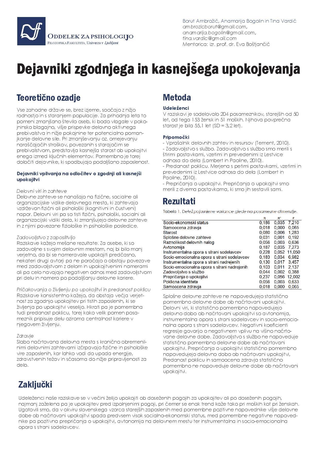 V Sloveniji je bila izvedena raziskava o dejavnikih zgodnjega in kasnejšega upokojevanja. Zajemala je 204 posameznike, starejše od 50 let. Rezultati so pokazali, da se večina namerava upokojiti, ko so pogoji za upokojitev že doseženi oz. preseženi, pri čemer se enak trend kaže pri obeh spolih. Socialno-ekonomski status je pomembno vplival na višjo delovno dobo, medtem ko pozitivna prepričanja o upokojitvi, avtonomija na delovnem mestu ter opora s strani sodelavcev vplivajo na to, da gredo starejši zaposleni v pokoj prej.