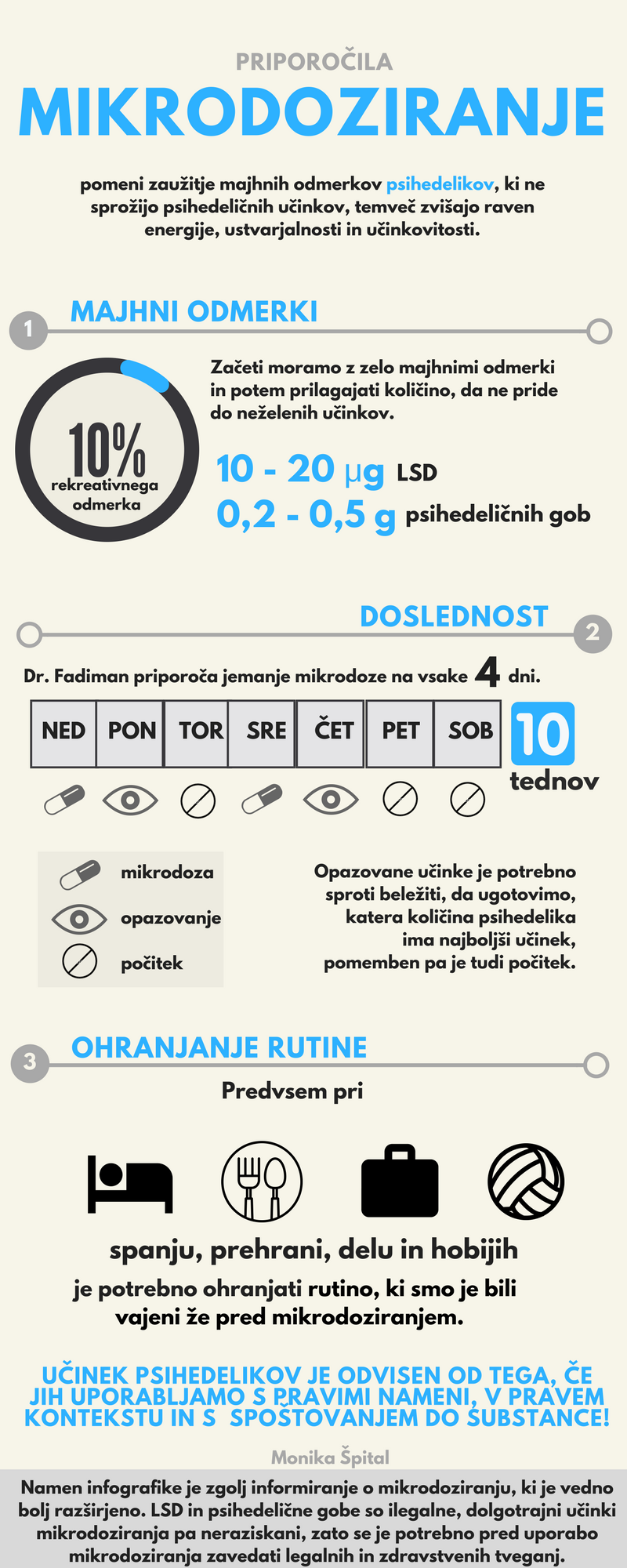 Mikrodoziranje pomeni zaužitje majhnih odmerkov psihedelikov, ki ne sprožijo psihedeličnih učinkov, temveč zvišajo raven energije, ustvarjalnosti in učinkovitosti. Več splošnih informacij ter prednosti in slabosti mikrodoziranja ne delovnem mestu najdete na spodnjih dveh infografikah.