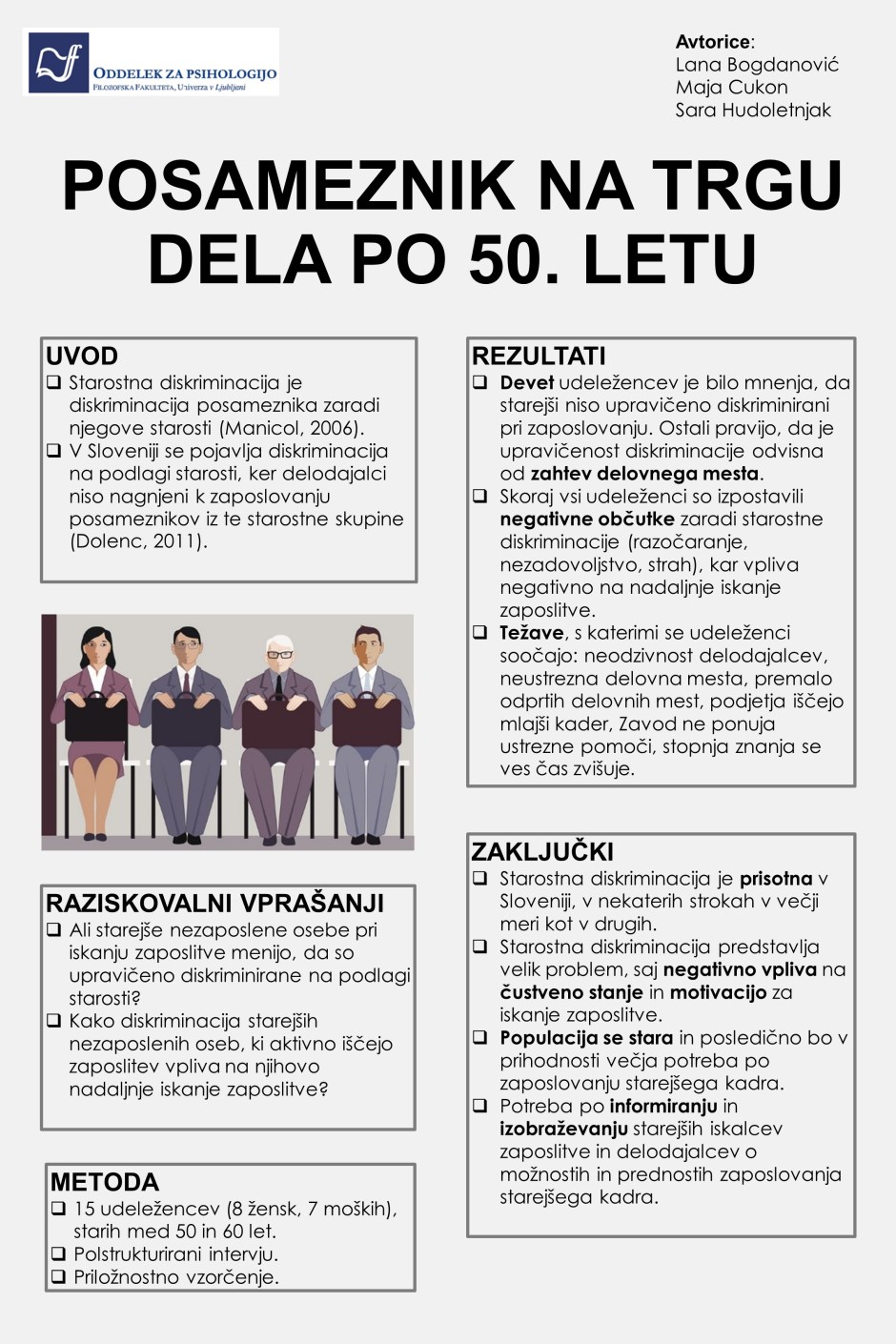 Študentke psihologije je v raziskavi zanimalo, ali imajo osebe, starejše od 50 let izkušnje s starostno diskriminacijo, s kakšnimi težavami se soočajo, ali mislijo, da je starostna diskriminacija upravičena ter kako le-ta vpliva na njihovo počutje in motivacijo za iskanje zaposlitve. S pomočjo polstrukturiranega intervjuja so intervjuvale 15 nezaposlenih oseb, starejših od 50 let, ki trenutno aktivno iščejo zaposlitev v Sloveniji. Rezultati so pokazali, da ima večina udeležencev osebne izkušnje s starostno diskriminacijo pri iskanju zaposlitve ter menijo, da je le-ta zelo prisotna v Sloveniji. Kot težave, s katerimi se soočajo pri iskanju zaposlitve so večinoma omenjali neodzivnost delodajalcev, nezadostno število prostih delovnih mest in preferiranje mlajšega kadra s strani delodajalcev.