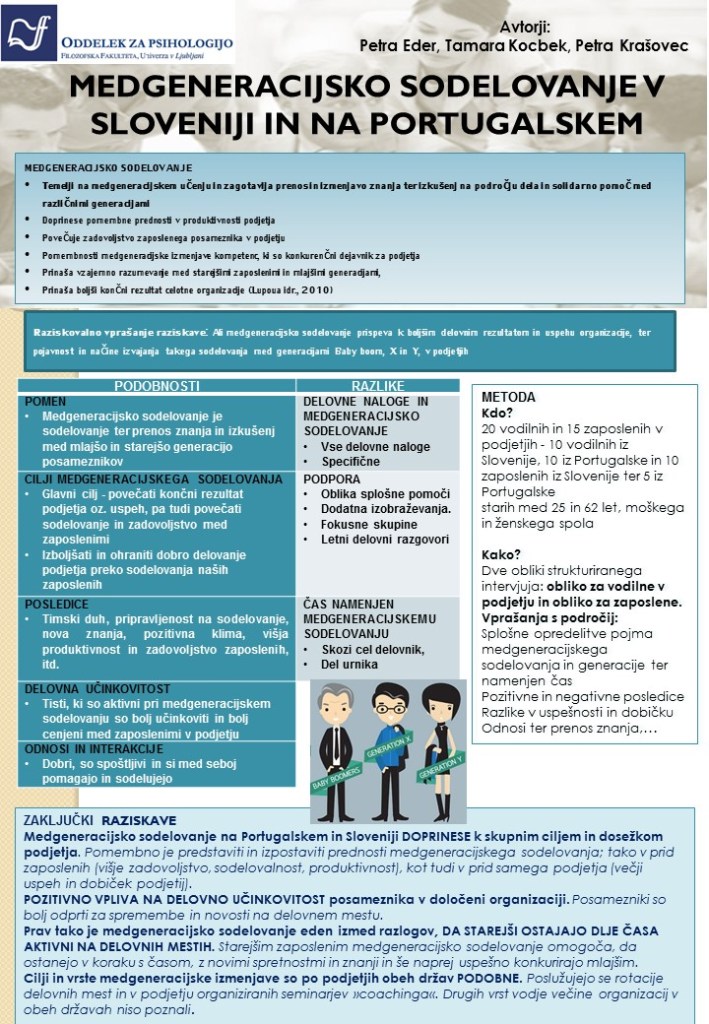 V njihovi raziskavi je sodelovalo 10 vodilnih in 5 zaposlenih v podjetjih iz Portugalske in 10 vodilnih ter 10 zaposlenih v podjetjih iz Slovenije. Za namene raziskave so oblikovale dve obliki strukturiranega intervjuja: za vodilne in zaposlene v podjetjih ter jih po izvedbi obdelale s postopkom kodiranja. Ugotovile so, da medgeneracijsko sodelovanje doprinese k višjim rezultatom, višji delovni učinkovitosti in dobičku podjetij v obeh državah in je tudi eden izmed vzrokov, da starejši ostajajo dlje časa aktivni na trgu dela. Zaključki raziskave kažejo številne pozitivne rezultate medgeneracijskega sodelovanja, ki so uporabni v vsaki organizaciji, ki zaposluje različno stare posameznike, ne glede na vrsto dela, delovnih ciljev in nalog.