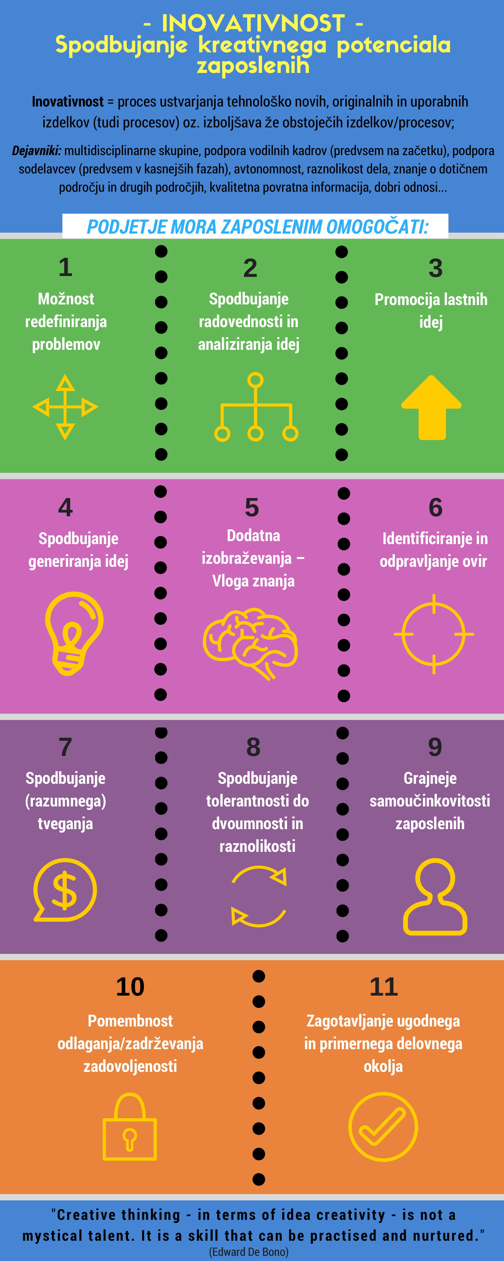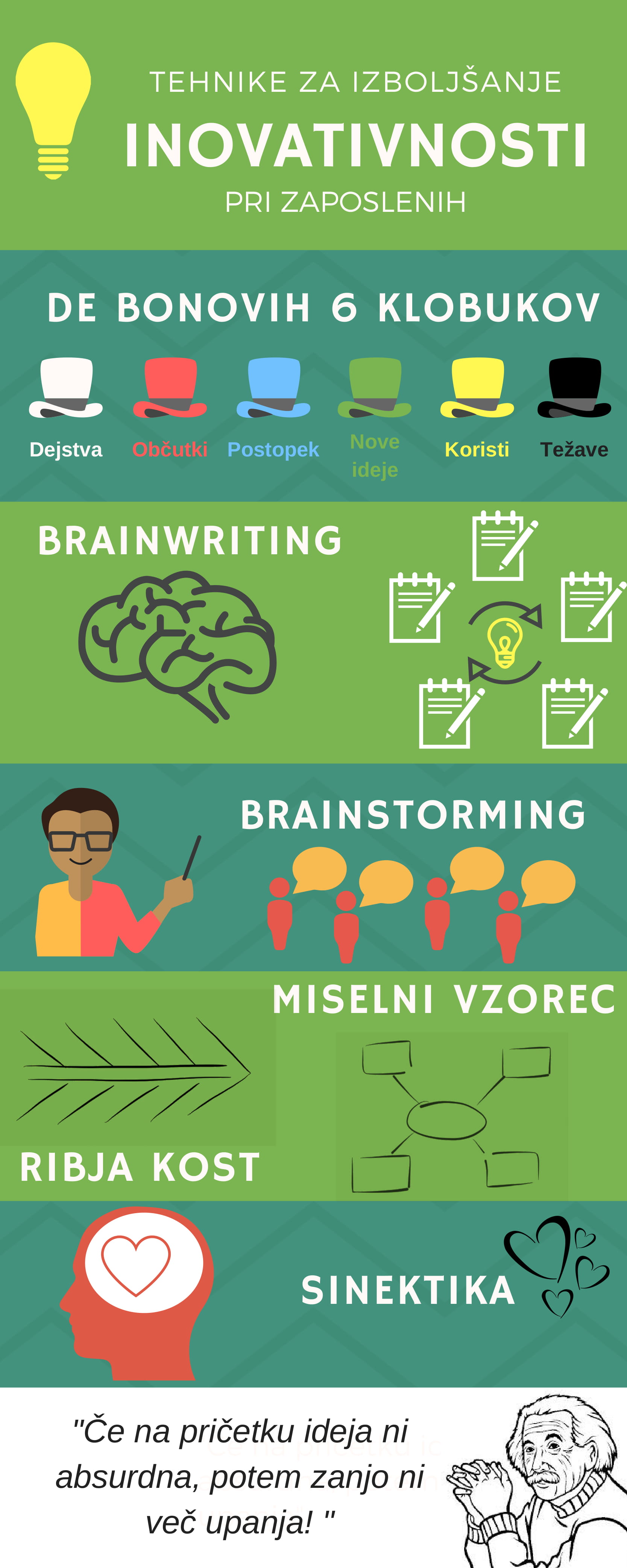 Inovativnost je na delovnem mestu izredno pomembna. In prav je, da so spodbujate. Na spodnjih dveh infografikah si lahko ogledate nekaj ključnih pojmov o tem, kaj je inovativnost in zakaj je na delovnem mestu pomembna; ogledate si lahko eno izmed popularnejših in najbolj razširjenih oblik spodbujanja inovativnosti pri zaposlenih (De Bonovih 6 klobukov), prav tako pa si lahko ogledate, kaj naj bi podjetje omogočalo svojim zaposlenim, da bi slednji razmišljali in delovali bolj inovativno.