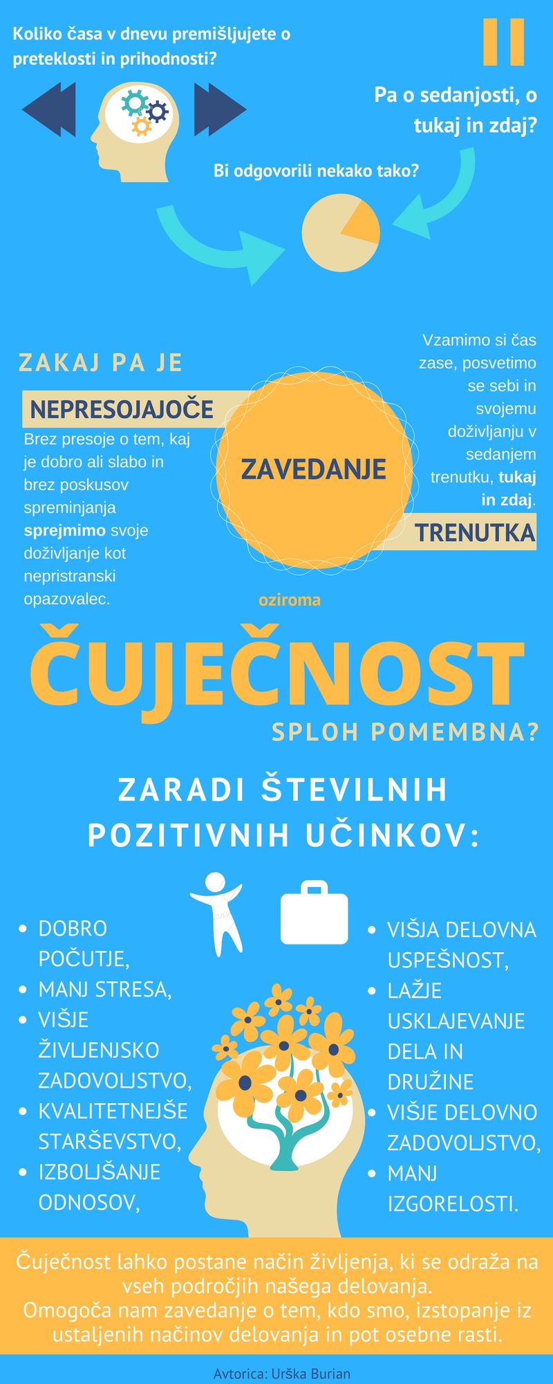 Danes z vami delimo dve infografiki na temo čuječnosti. V prvi infografiki si lahko preberete o tem kaj čuječnost je in kakšni so njeni številni pozitivni učinki.