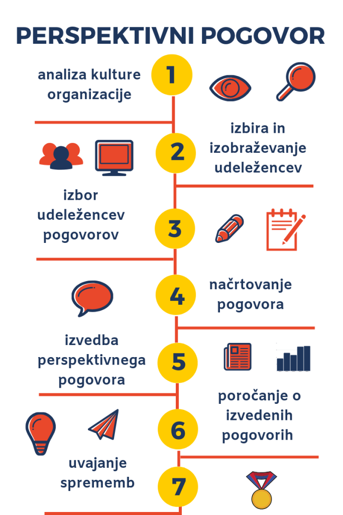 Perspektivni pogovor ali izvorno “stay interview” je relativno nova metoda, ki jo organizacije uporabljajo za ohranjanje pomembnih in kvalitetnih uslužbencev. Definiran je kot strukturirana diskusija, ki jo vodja izvede z vsakim posameznim uslužbencem, da ugotovi katere specifične ukrepe mora izvesti, da bo okrepil posameznikovo pripadnost organizaciji in zagotovil njegov obstoj v njej. Primarni namen perspektivnega pogovora je ohranjanje dobrega kadra, skozi povečanje zaupanja med nadrejenim in podrejenimi, zadovoljstva z delom, pripadnosti organizaciji in zavzetosti pri delu. Ko se odločamo za uporabo perspektivnega pogovora pa moramo biti pozorni, saj metoda od vseh udeležencev zahteva jasno, iskreno in odprto komunikacijo ter zaupanje. Če kultura organizacije take vrste komunikacije ne podpira, izvedba perspektivnega pogovora ne bo dala želenih rezultatov.