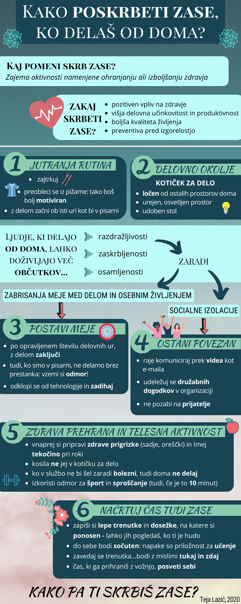 Pri delu od doma se naš delovni čas hitro zavleče v dodatno uro ali več, le malo časa pa posvetimo sebi. Tako kot ima vsak svoj način dela od doma, je tudi skrb zase za nekoga sproščujoča kopel, za drugega šport, za tretjega pa spletni tečaj čuječnosti. Kaj skrb zase sploh pomeni, zakaj je pomembna in kako jo lahko prakticiramo si lahko ogledate v spodnji infografiki. Ne pozabite nase!