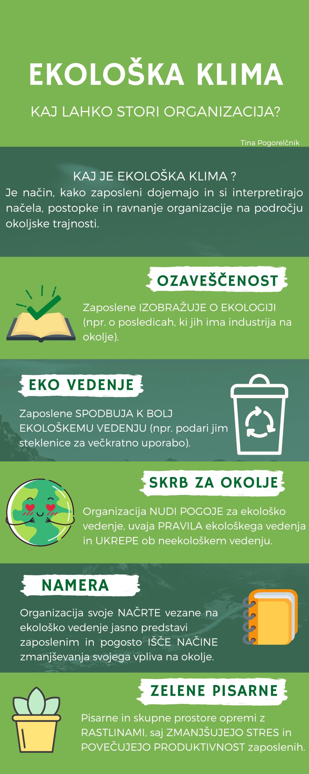 Dobra ekološka klima v organizaciji je ključnega pomena, da se zaposleni vedejo bolj ekološko. Za optimalno ekološko klimo, pa moramo poskrbeti za več področij, ta pa so predstavljena v infografiki. Upajmo, da bomo s pomočjo te infografike k bolj ekološkemu vedenju spodbudili čim več organizacij.