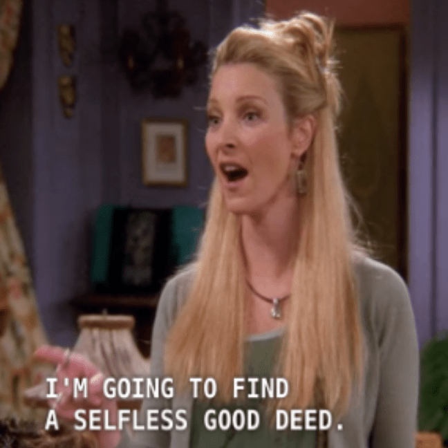 Medtem, ko se Joey in Phoebe prepirata, Joey reče: »Pheebs, nesebična dobra dela ne obstajajo. Žal!« Na koncu Phoebe tudi ne uspe najti nobenega nesebičnega dobrega dela. Morda pa je Joey vendarle imel prav? Zaključila bi lahko, da sicer obstajajo altruistični motivi za prostovoljstvo, vendar so v večini primerov, če ne vedno, prisotni tudi egoistični razlogi. Vprašati pa se moramo ali je tako prav? Kajti prostovoljstvo je v prvi vrsti fokusirano na druge, ne na nas in naše potrebe. V teoriji gre za opravljanje nekega dela, storitve, podpore drugim, ne da bi pri tem pričakovali v zameno kakšno koli plačilo ali nagrado.