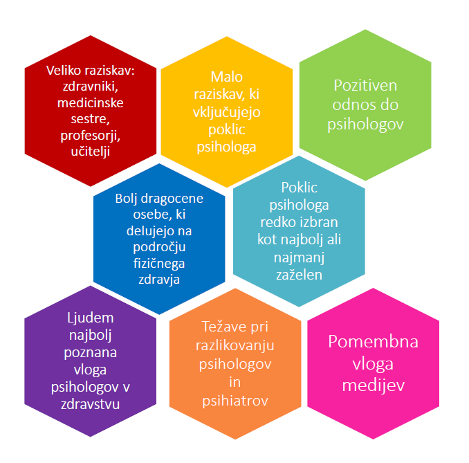 - Podoba poklica psihologa se razlikuje od podobe poklica ZDRAVNIKA – psihologe so udeleženci ocenjevali kot manj odtujene, egoistične, strokovne, izobražene in spoštovane ter bolj vedoželjne in potrpežljive.