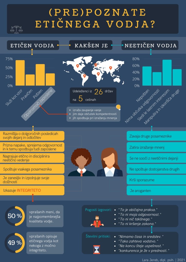 Etičnega vodjo lahko od neetičnega prepoznamo po več lastnostih. Med njimi je izrazito pomembno izkazovanje integritete. Povprečno 61% udeležencev iz Avstrije, Nemčije, Irske, ZDA, Kitajske in Hong Konga meni, da se integriteta kaže v skladnosti med vrednotami in dejanji vodje. Ta dejanja vodje pa morajo biti v skladu z moralnimi in etičnimi načeli. Tisti, ki vodi z integriteto, se tudi uči na napakah ter jasno in transparentno komunicira s svojimi zaposlenimi. Katere so še ostale lastnosti, po katerih lahko ločimo etične in neetične vodje, si lahko ogledate na spodnji infografiki.