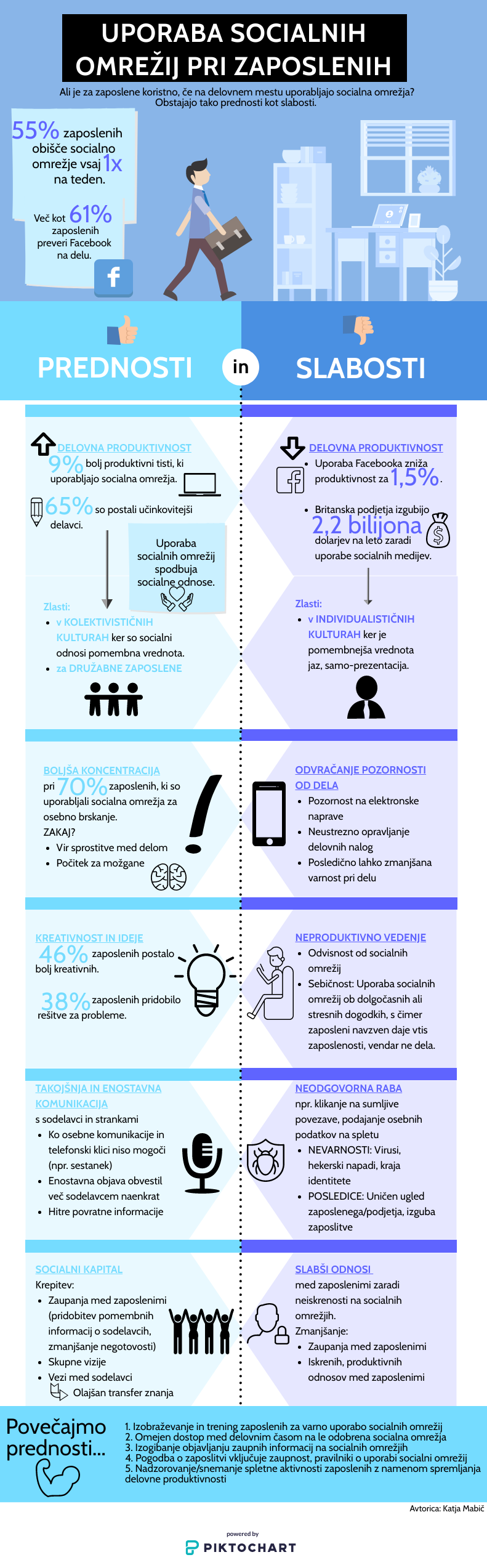 V današnji infografiki se dotikamo uporabe socialnih omrežij pri zaposlenih. Predstavljamo prednosti in slabosti uporabe socialnih omrežij, prav tako pa damo nasvete o tem, kako povečati prednosti uporabe socialnih omrežij pri zaposlenih.