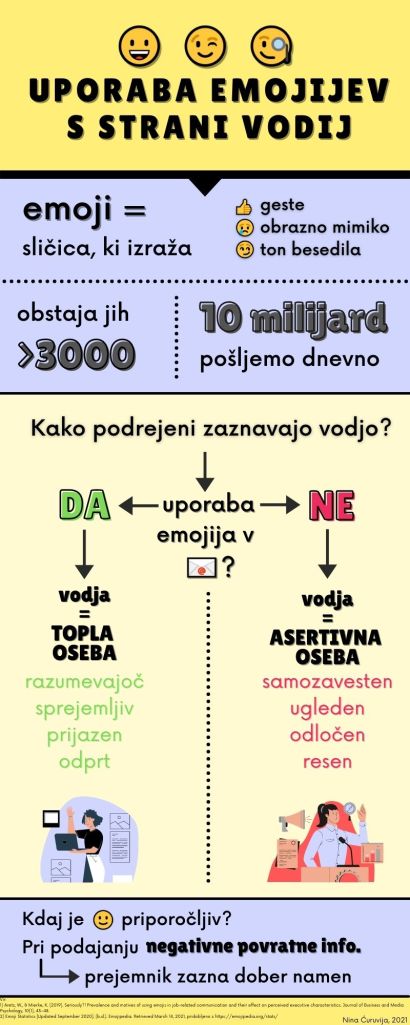 V tokratnem prispevku objavljamo infografiko o uporabi emojijev s strani vodij, v kateri boste našli nekaj zanimivih dejstev o emojijih, informacije o tem, kako zaposleni zaznavajo tisto vodjo, ki emojije uporablja in tisto vodjo, ki jih ne, ter kdaj je uporaba emojijev priporočljiva.