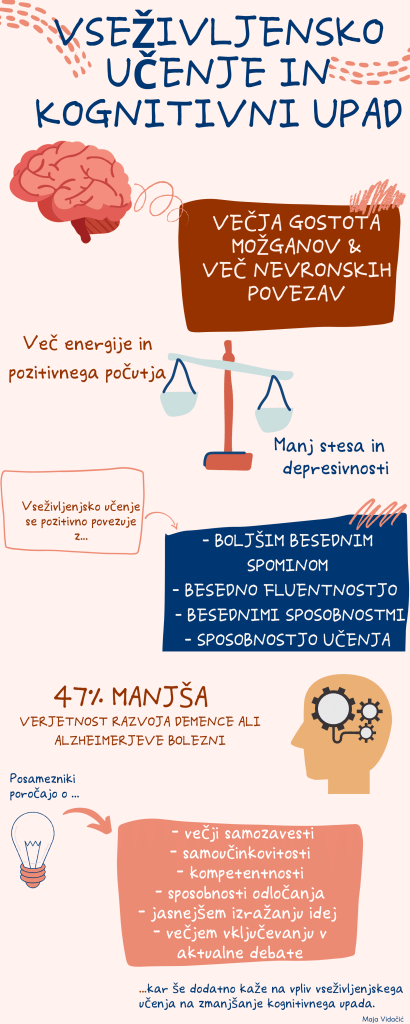 Danes vse večji problem predstavljajo demenca, Alzheimerjeva bolezen in druge težave, s katerimi se soočajo starejši in jim otežujejo življenje ter nižajo blagostanje. Vseživljenjsko učenje predstavlja okno, kako zmanjšati kognitivni upad pri posameznikih. O učinkih implicitnih starostnih stereotipov na zaposljivost starejših ter o tem, kako spodbuditi zaposlovanje starejših, smo že pisali. V tokratnem prispevku pa si preberite infografiko o vseživljenjskem učenju in kognitivnem upadu.