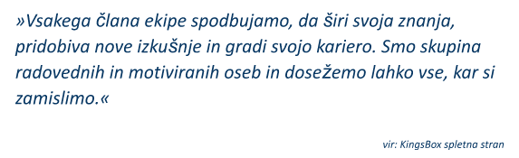 KingsBoxerje najbolj definirajo tri stvari. Smo mlada ekipa, katere povprečna starost ne presega 26 let. Vsi si delimo ljubezen do športa, pri čemer je nekaterim redna športna aktivnost veliko pomenila že pred zaposlitvijo, nekateri pa so svoje navade in ambicije pričeli razvijati s priključitvijo v ekipo. Ljubezen gojimo na rednih skupnih treningih crossfita, ki jih izvajamo pod nadzorom trenerja. Namen treningov je med drugim tudi to, da zaposleni spoznajo in preizkusijo opremo, ki jo razvijamo in prodajamo. Kot tretjo, a najpomembnejšo lastnost, pa bi izpostavila skupno mentaliteto rasti oz. močno željo po nenehnem razvoju, tako na osebnem kot tudi na kariernem področju.