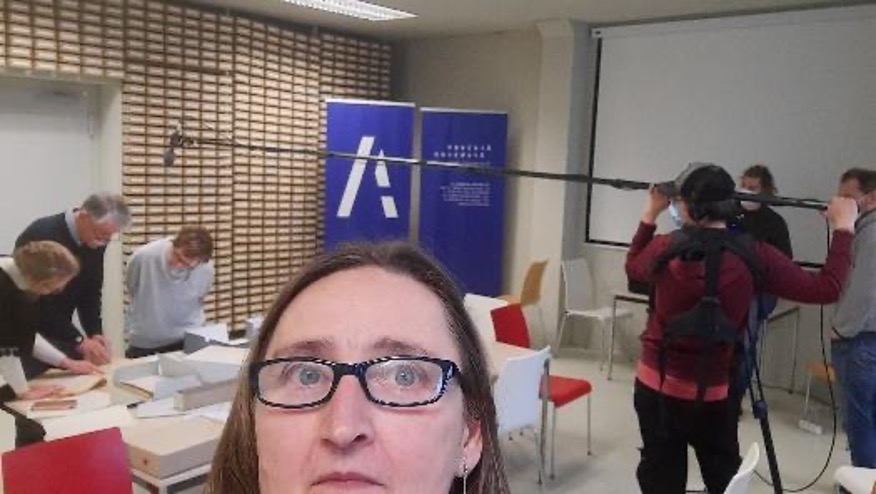 Maja Weiss na snemanju s filmsko ekipo pri celovečernem dokumentarcu Zajeti v izviru – slovenski otroci Lebensborna v arhivu Bad Arolsen v Nemčiji, februar 2022
