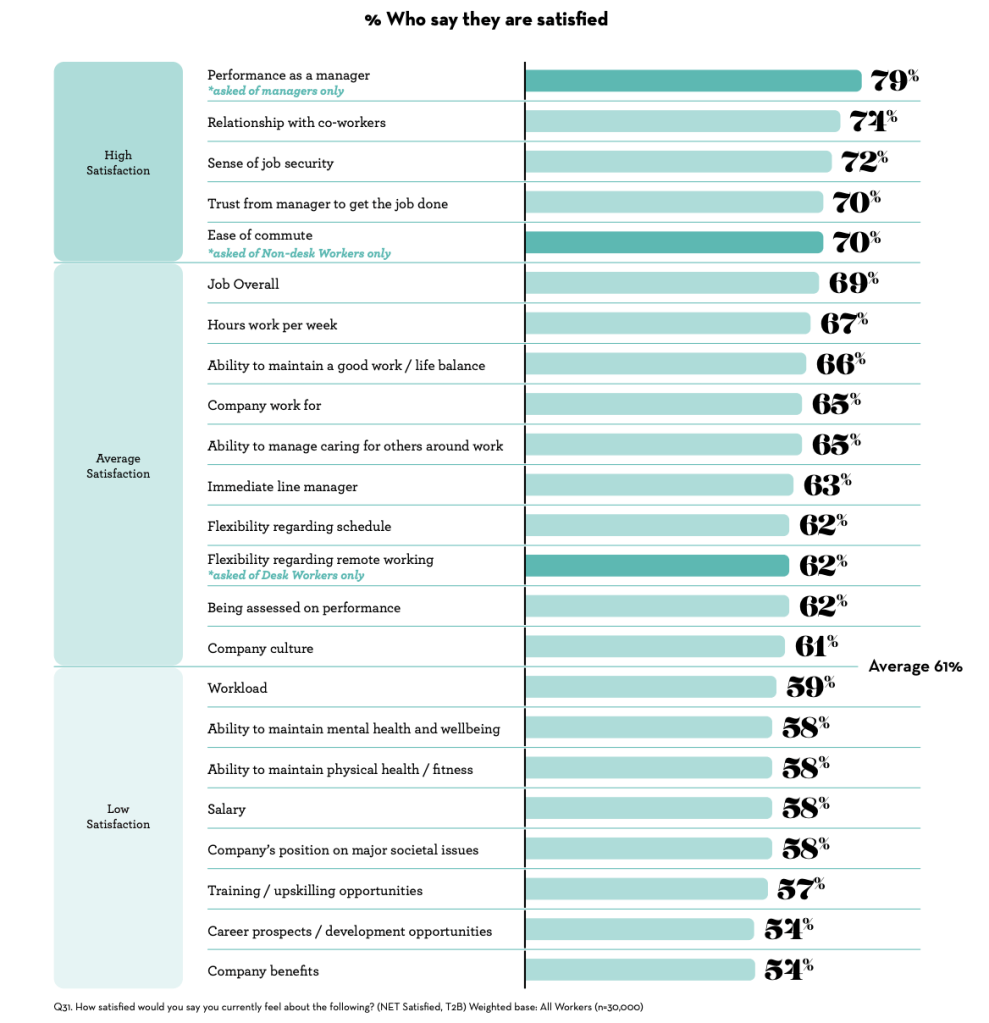 Organizacije pogosto povezujejo zadovoljstvo zaposlenih neposredno s poslovnimi rezultati in produktivnostjo. Zanimivo je kljub prej opisanim željam po menjavi zaposlitve na svetovni ravni zadovoljstvo z delom še vedno visoko visoko, saj je 69 % anketirancev navedlo, da so na splošno zadovoljni z delom, kar je več od 67 % leta 2021.