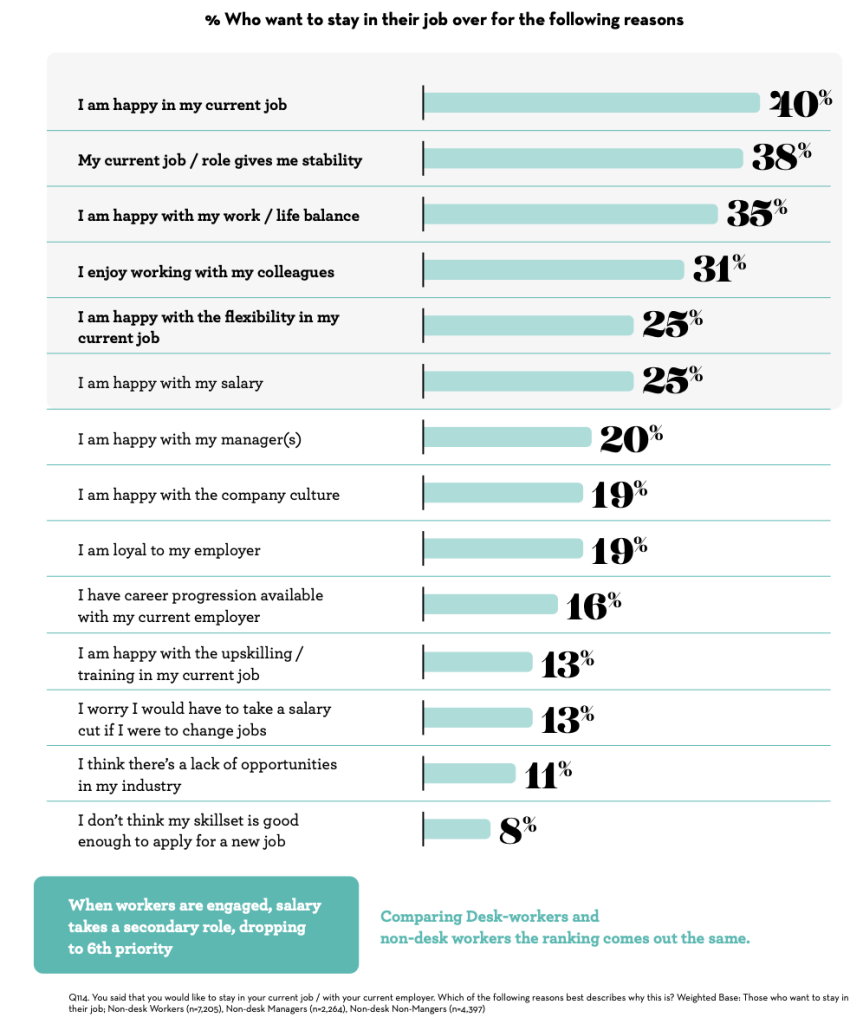 Rezultati študije kažejo tudi, da ni vse v denarju in želji po višji plači. Med zavzetimi zadovoljnimi delavci plača pade šesto mesto seznama razlogov, da so se odločili v podjetju, kjer delajo, ostati še eno leto.