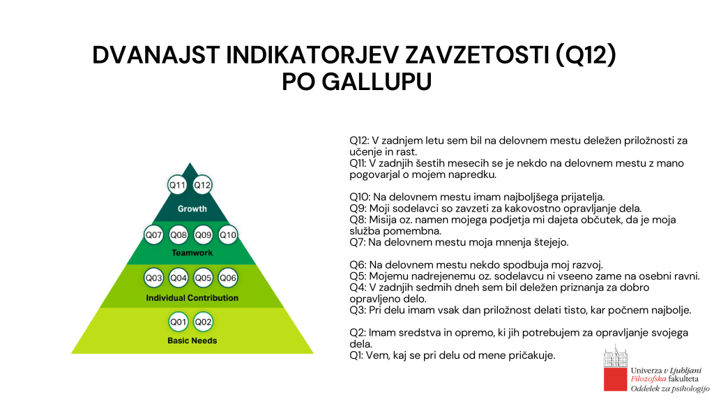 Gallupov vprašalnik 12 indikatorjev zavzetosti je sestavljen iz dvanajstih postavk, ki preverjajo, v kolikšni meri so uresničene potrebe zaposlenih na področjih: