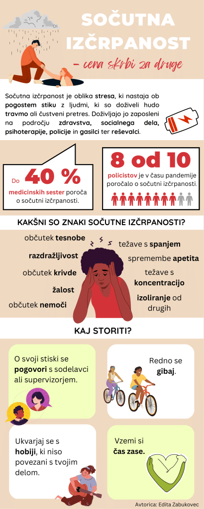 Težke izkušnje ljudi redko koga pustijo hladnega. Zaposleni, ki tem ljudem pomagajo, pa morajo kljub čustvenemu doživljanju ohranjati profesionalnost in nuditi najboljšo možno oskrbo. Vsakodnevno nalaganje čustvenega napora pri zaposlenih lahko čez čas pusti negativne posledice. Kako jih lahko prepoznamo in kako preprečimo? Preverite v spodnji infografiki.