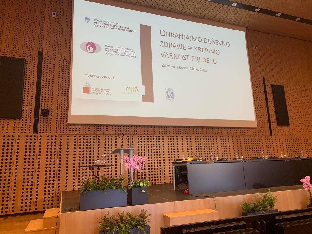Sončno jutro in svež zrak na Brdu pri Kranju sta napovedovala dan, poln energije in idej. Več kot 500 udeležencev se je v torek, 18. aprila, udeležilo konference Ohranjajmo duševno zdravje = krepimo varnost pri delu. Organizirali sta jo Ministrstvo za delo, družino, socialne zadeve in enake možnosti ter Zbornica zdravstvene in babiške nege – Zveza strokovnih društev medicinskih sester, babic in zdravstvenih tehnikov. Pester strokovni program so dopolnjevale aktivnosti in informacije na stojnicah različnih organizacij, med drugim tudi naše spletne strani.