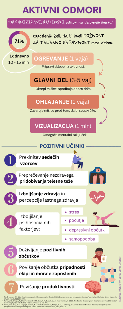 V spodnji infografiki si poglejte splošno zasnovo odmora in njegove pozitivne učinke. K gibanju pa naj vas dodatno spodbudi še ta članek z videom, v katerem najdete demonstracije vaj, ki jih lahko izvajate.