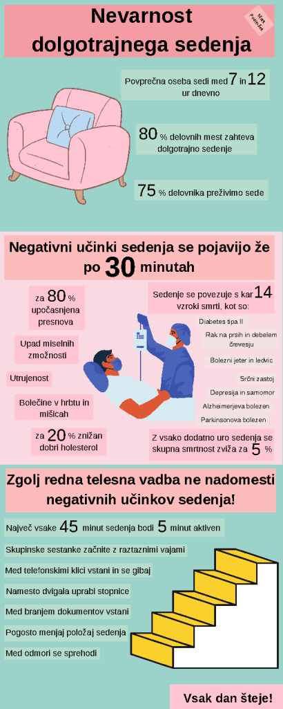 V povprečju posameznik sedi med 7 in 12 ur dnevno, torej med slabo tretjino in polovico dneva. To za sabo prinaša mnoge nevšečnosti, zato smo o pomenu aktivnih odmorov na delovnem mestu že pisali. Tokrat objavljamo infografiko, ki naslavlja negativne učinke dolgotrajnega sedenja in predlaga tudi možne rešitve.