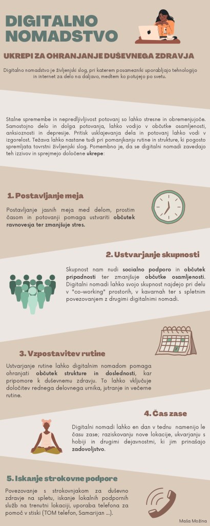 Sama narava dela digitalnih nomadov je lahko zaradi stalnih sprememb in nepredvidljivosti potovanj precej stresna in obremenjujoča. Zaradi samostojnega dela in dolgih potovanj, lahko doživljajo občutke osamljenosti, anksioznosti ter depresije. Tudi sam pritisk dela in potovanj lahko vodi v izgorelost. In kako lahko zaposleni skrbijo za svoje duševno zdravje pri spoprijemanju z vsemi izzivi, ki jih prinaša takšen način dela? V naslednji infografiki si lahko ogledate pet glavnih ukrepov za ohranjanje duševnega zdravja med digitalnimi nomadi.