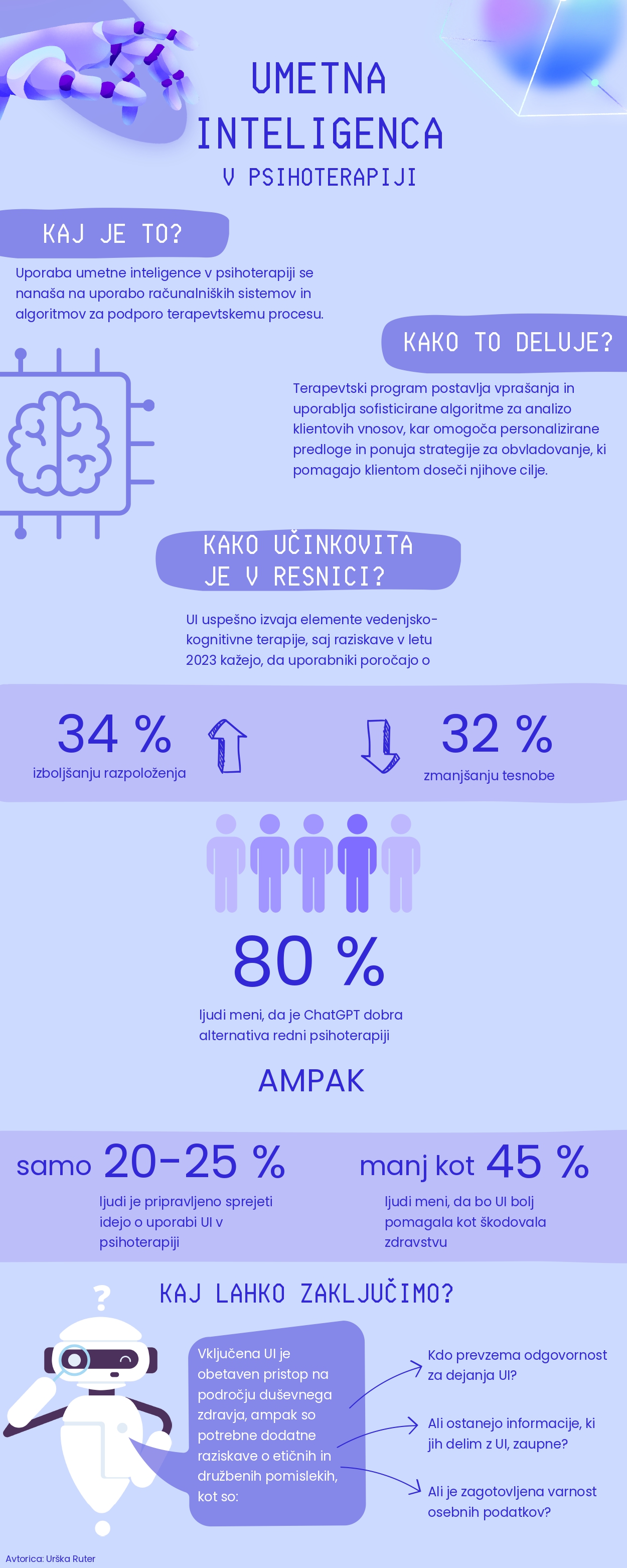 Umetna inteligenca (UI) počasi, a zanesljivo vstopa v različna področja našega življenja, vključno s psihoterapijo. Spodnja infografika raziskuje, kako UI lahko podpira terapevtski proces z uporabo računalniških sistemov in algoritmov. Terapevtski programi, ki temeljijo na UI, postavljajo vprašanja in analizirajo odgovore klientov, da bi jim ponudili personalizirane predloge in strategije za obvladovanje težav. V infografiki najdete podatke o uspešnosti UI v procesu psihoterapije in o tem, ali je za takšno uporabo potrebna kakšna previdnost.