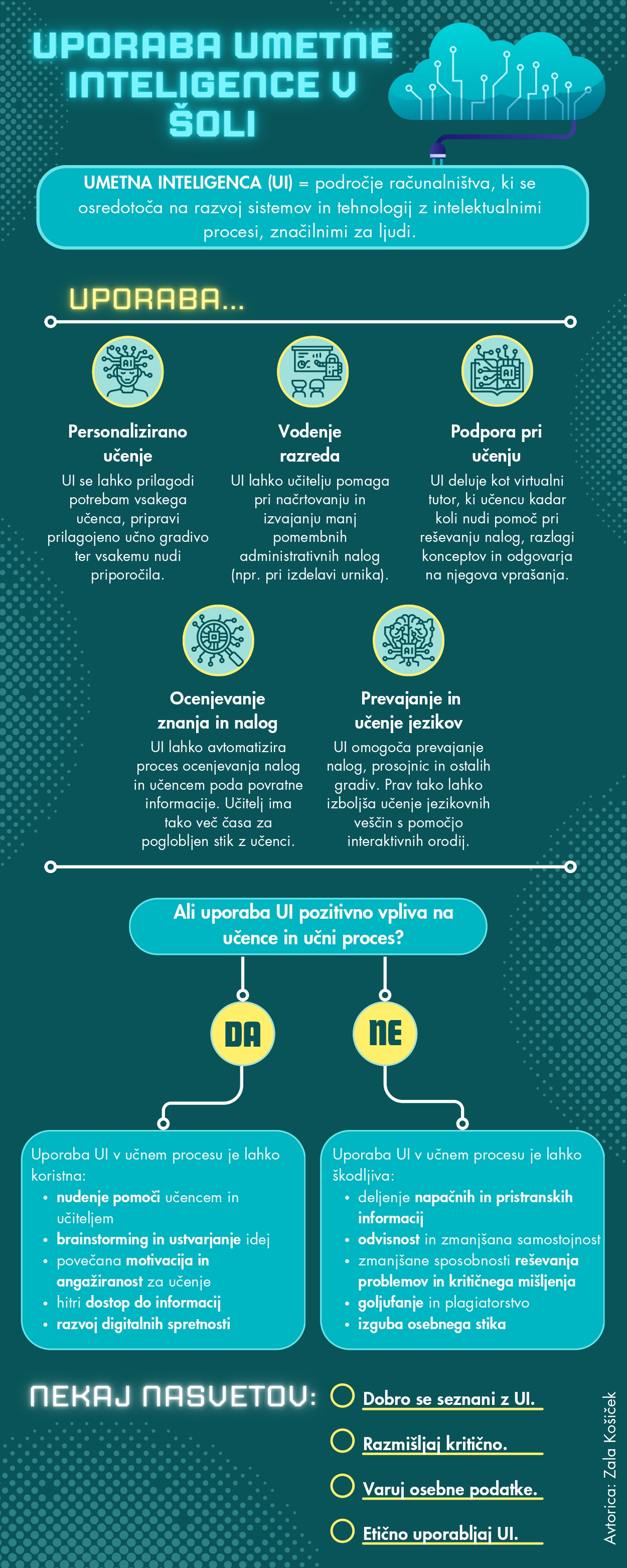 Umetna inteligenca (UI) ima vse večjo vlogo v sodobnem učnem okolju, kjer tako učiteljem kot učencem ponuja različne možnosti za izboljšanje učnega procesa. V infografiki so predstavljeni načini uporabe UI v šoli. UI lahko v učnem procesu deluje kot podporno orodje za personalizirano učenje, podporo pri učenju, pri učenju jezikov, vodenju razreda in ocenjevanju. V infografiki so zajete prednosti in izzivi uporabe UI v šolah, navedeni pa so tudi napotki varne uporabe.