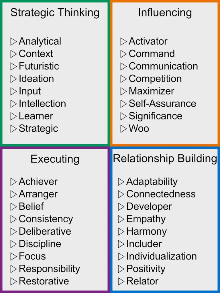 Poročilo je sestavljeno iz 34 talentov oz. vrlin, ki so pri vsakem posamezniku razdeljene od najbolj do najmanj izraženih. Talenti so razdeljeni v 4 barve (zelena = strateško mišljenje, modra = grajenje odnosov, oranžna = vplivanje, vijolična = izvrševanje). Pri delu se fokusiramo na prvih 5 vrlin, ki so najmočnejše in kažejo na motivacijo posameznika – so kot filter, skozi katerega gledamo na svet in različne situacije, kar vpliva na naše mišljenje, čustvovanje in vedenje. Poročilo izpostavi naše talente in nam pomaga pri ozaveščanju naših vrlin, kar pa je le prvi korak – naša vloga je, da talente razvijemo in krepimo – to je tudi področje, pri katerem zaposlenim nudimo podporo. Tudi Dončić je naravni talent, ampak mora kljub temu še vedno krepiti svojo fizično pripravo, sodelovati z ekipo in graditi na svoji pripravljenosti, da lahko svoje talente krepi in razvija.