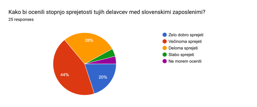 Odzivi v anketi so bili razdeljeni. Na eni strani nekatera podjetja raznolikost razumejo kot prednost in jo aktivno negujejo. Eden izmed sodelujočih je zapisal: “Zaposlujemo ljudi iz 25 različnih držav, tudi z različnih kontinentov. Menim, da je manjko težav povezan z visoko izobrazbeno strukturo in s prepričanjem, da je naša raznolikost obenem naša prednost. Veliko pozornosti namenjamo ozaveščanju zaposlenih o (ne)ustreznih načinih komuniciranja.”