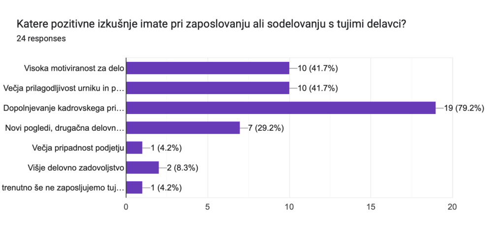 S kratko anketo na LinkedInu, v kateri je sodelovalo 25 predstavnikov slovenskih organizacij, sem želela osvetliti prve izkušnje s tujimi delavci. Vzorec je majhen, a že nakazuje trende. Najpogosteje prihajajo delavci iz Bosne in Hercegovine, Srbije in Severne Makedonije. Prisotni so tudi kandidati iz bolj oddaljenih držav, kot so Indija, Nepal, Pakistan, Iran in celo Filipini. Ta razpršenost jasno kaže, da se podjetja pri iskanju kadra odpirajo novim trgom, ne glede na kulturno ali geografsko oddaljenost.