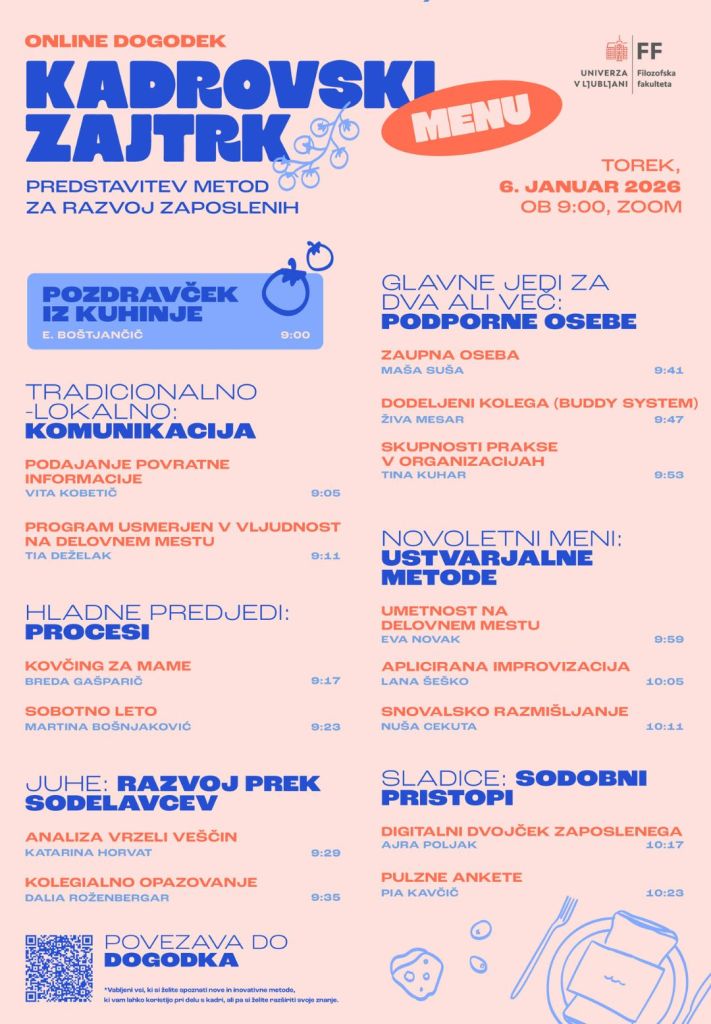 Si v novem letu želite še več znanja, kot ga imate zdaj? Predstavljamo vam cel zajtrk novih kadrovskih znanj! Za vas imamo kup metod za razvoj zaposlenih, ki jih lahko uporabite tudi vi. Če se sprašujete, kje to lahko naročite, ste na pravem mestu, saj smo 6. 1. 2025 v kavarni Kadrovskega zajtrka za vas pripravili prav poseben meni, z najslastnejšimi HR-ovskimi specialitetami.