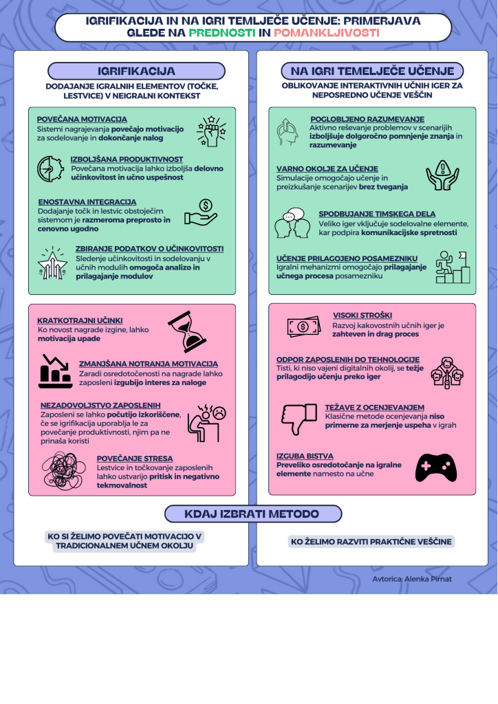 Infografika prikazuje primerjavo med igrifikacijo in na igri temelječim učenjem. Igrifikacija prinaša prednosti, kot so večja motivacija, boljša produktivnost, enostavna integracija v obstoječe sisteme ter možnost zbiranja podatkov o učinkovitosti, vendar ima tudi slabosti, kot so kratkotrajni učinki, zmanjšanje notranje motivacije, nezadovoljstvo zaposlenih in povečan stres zaradi tekmovalnosti.