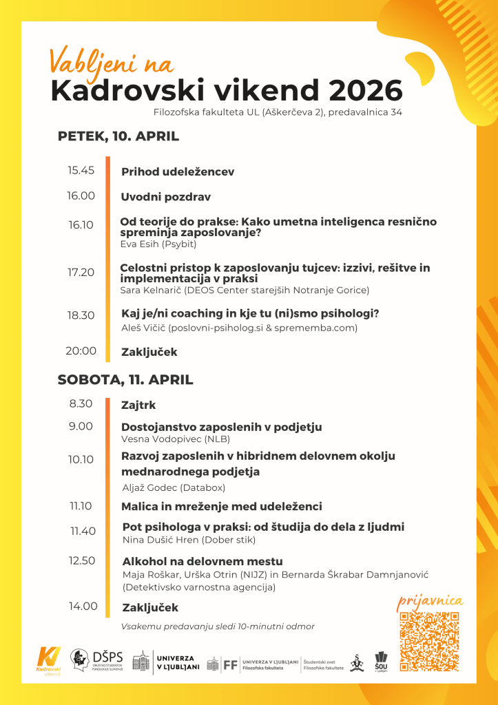 10. in 11. aprila se bodo na Filozofski fakulteti Univerze v Ljubljani zvrstila štiri predavanja in tri interaktivna predavanja, na katerih bodo predavatelji poslušalcem ne le predajali teoretično znanje, temveč tudi svoje dragocene izkušnje iz prakse. Poleg obilice novega znanja vas čaka tudi sproščeno druženje, dobra energija in priložnost, da navežete nova poznanstva s strokovnjaki, psihologi in vsemi, ki jih zanima kadrovsko in organizacijsko področje. Za vse tiste, ki radi preizkušate svojo srečo, pa bosta potekali tudi dve nagradni igri s praktičnimi nagradami.